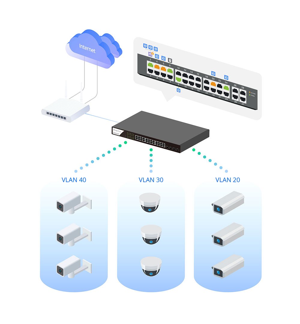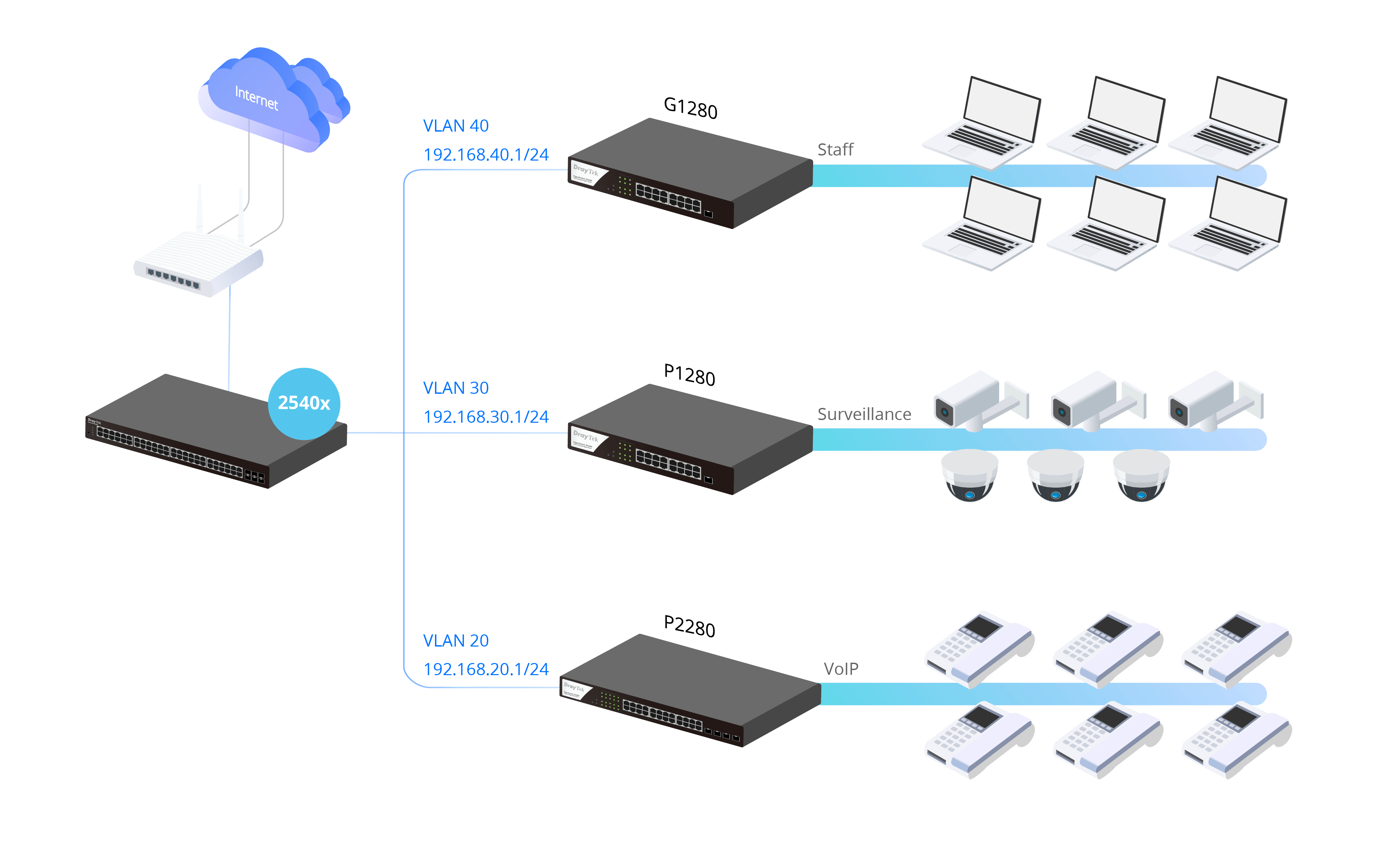 Set up VLAN easily from the router and get a centralized hierarchy view of the switches.