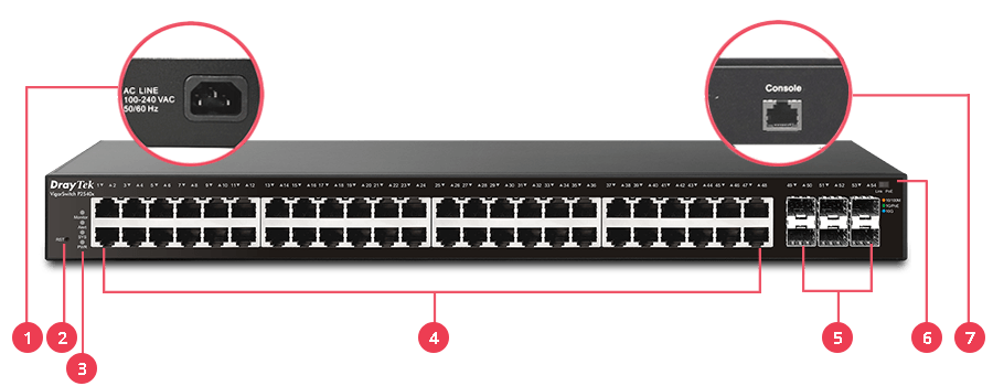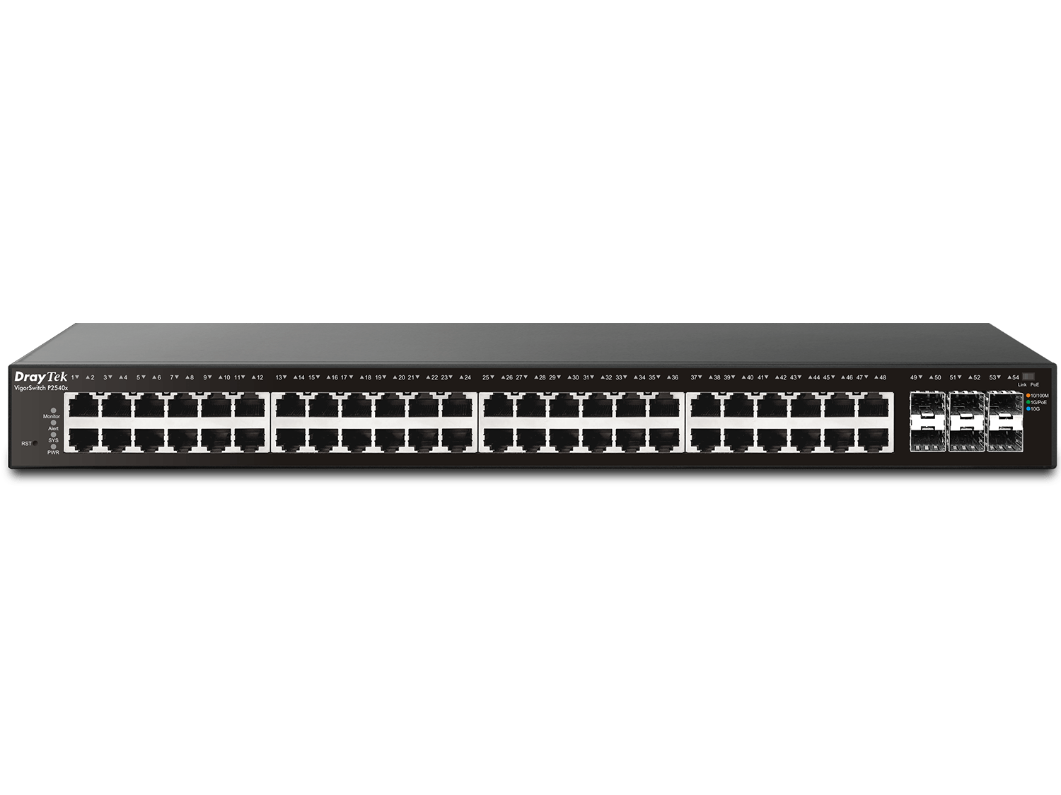 DrayTek VigorSwitch 2542x series is a Layer 2+ Managed 10 Gbps switch with 48 Gigabit Ethernet ports and 6 x SFP+ 10Gbps Fiber links. Supporting advanced Layer 3 features, DHCP Server and VLAN Routing. Moreover, it supports VLAN routing to route the inter-VLAN traffic directly, shares loads of the router, and improve overall network performance.